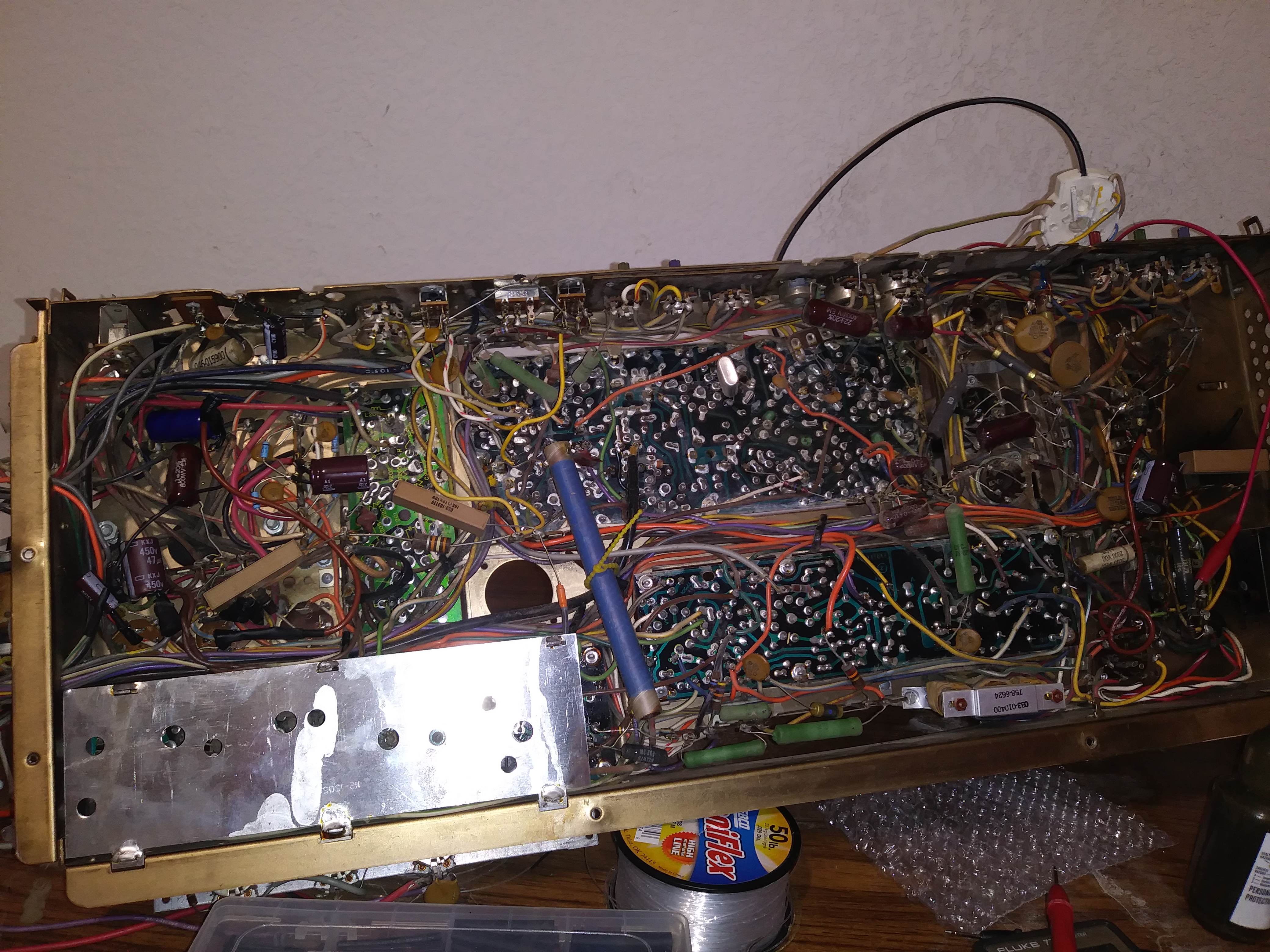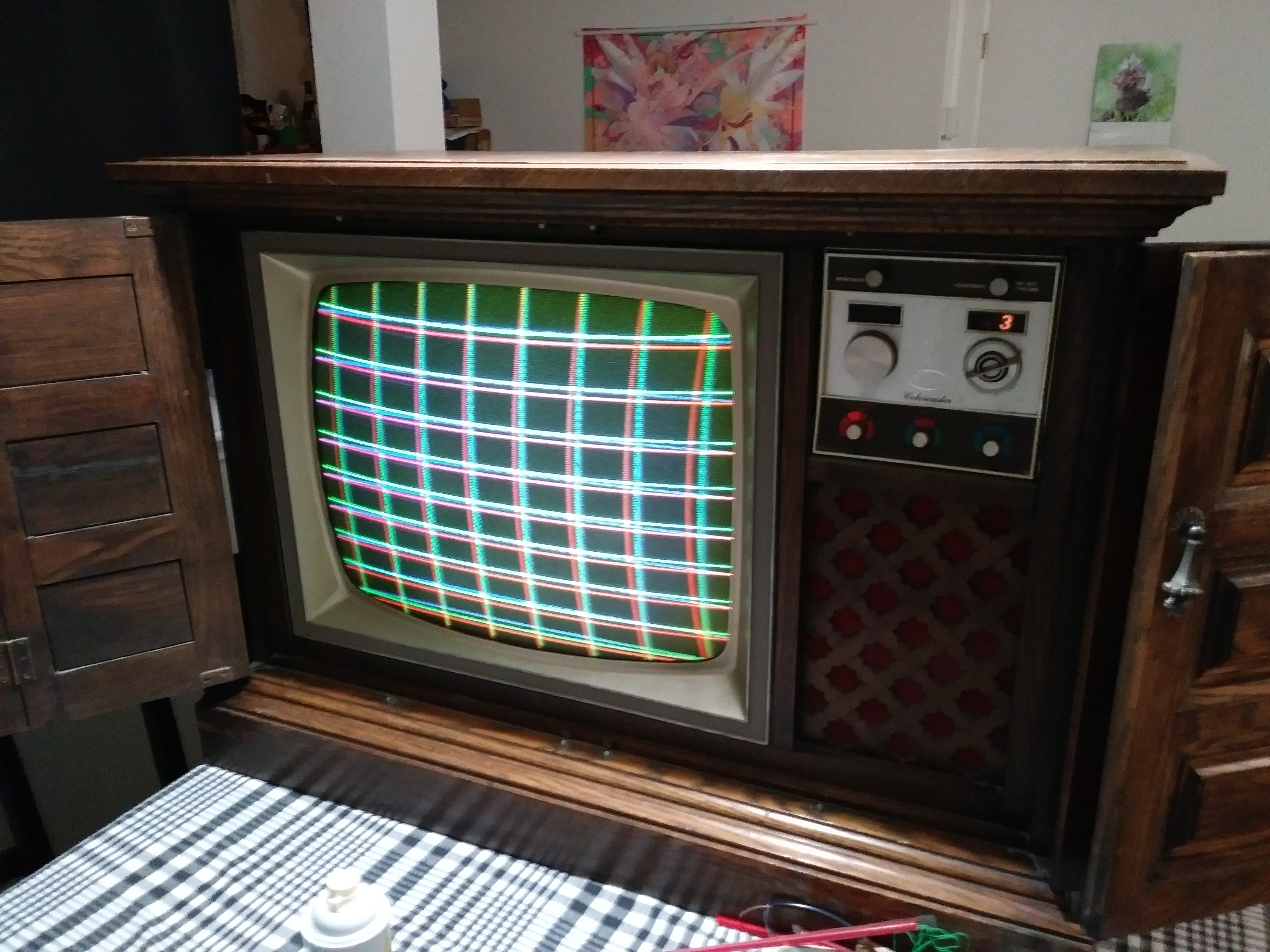http://suzaku.live-evil.org/0719221857.jpg https://www.youtube.com/watch?v=xos2MnVxe-c http://suzaku.live-evil.org/0719222043a.jpg and there is color! dirty! o http://suzaku.live-evil.org/0719222046.jpg the repair to the broken pin DID work! the video is sloppy, prob some weak tubes, many orig ones still in there, but now I know all I need to to move on to the restoration stage, |