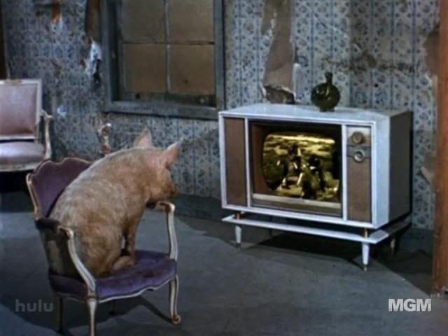 Why did I think it was Italian? I remember it was white, and the bezel (?) around the picture was of a black and white set. Ok, what make is the one Arnold is watching? Magnavox and Hotpoint had that style, and Motorola I think, even Admiral. Other things to watch out for are the "color" set on the dock in a dream sequence of "The Seven Year Itch", the Andrea "color" console in "Will Success Spoil Rock Hunter" and another "color" model in "The Girl Can't Help It". Thanks for putting this pic up.