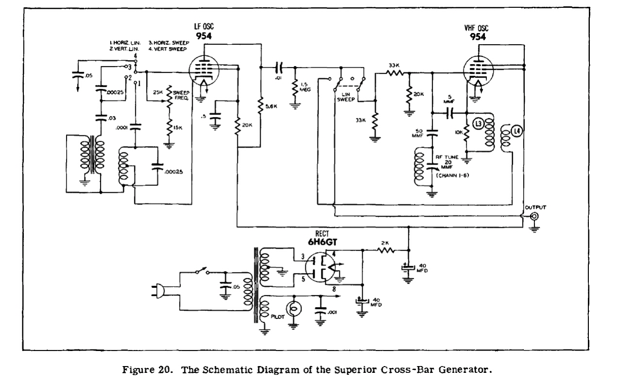 ![]() Schematic and article was found in How to understand and use TV test instruments by Milton S. Kiver. Page 99 - 100 The schematic predates the use of a war surplus 7193 for the rectifer. |