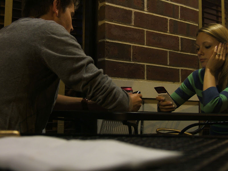 I was out to dinner with a couple friends a few weeks ago and couldn't resist but to take this photo as its just so typical of what I see today. If this doesnt explain that there is a serious problem than nothing will. Here two people go out to dinner on a date and instead they ignore each other and both are texting. I see this all the time and it makes me sick. Everyone (especially my age) is so dependent on their little cell phones. That all gaze into them like nothing else in the world matters. In my own experiences while dating, I've been interrupted numerous times as she "had to go outside and text someone really quick". Sorry, I don't go for that. I thought the idea of a date was to be with the other person and talk to them and enjoy their company? I guess I'm not up with the times.... Technology is really hurting people, social skills are going way down. Everyone wants to email or text instead of call on the phone as this way, they can avoid the confrontation and the emotional factor if the call is for unpleasant reasons, or avoid being put on the spot if someone asks a question you dont have a good answer for. I deal with this all the time at work too. People also like to email and text as a log to cover themselves incase of a problem or something goes wrong. "I told you about that in my email on september 8th, what the hell, hurry up". Now you're automatically at fault as there is conversation proof. To sum it up, it basically goes like this: "screw you hooray for me".