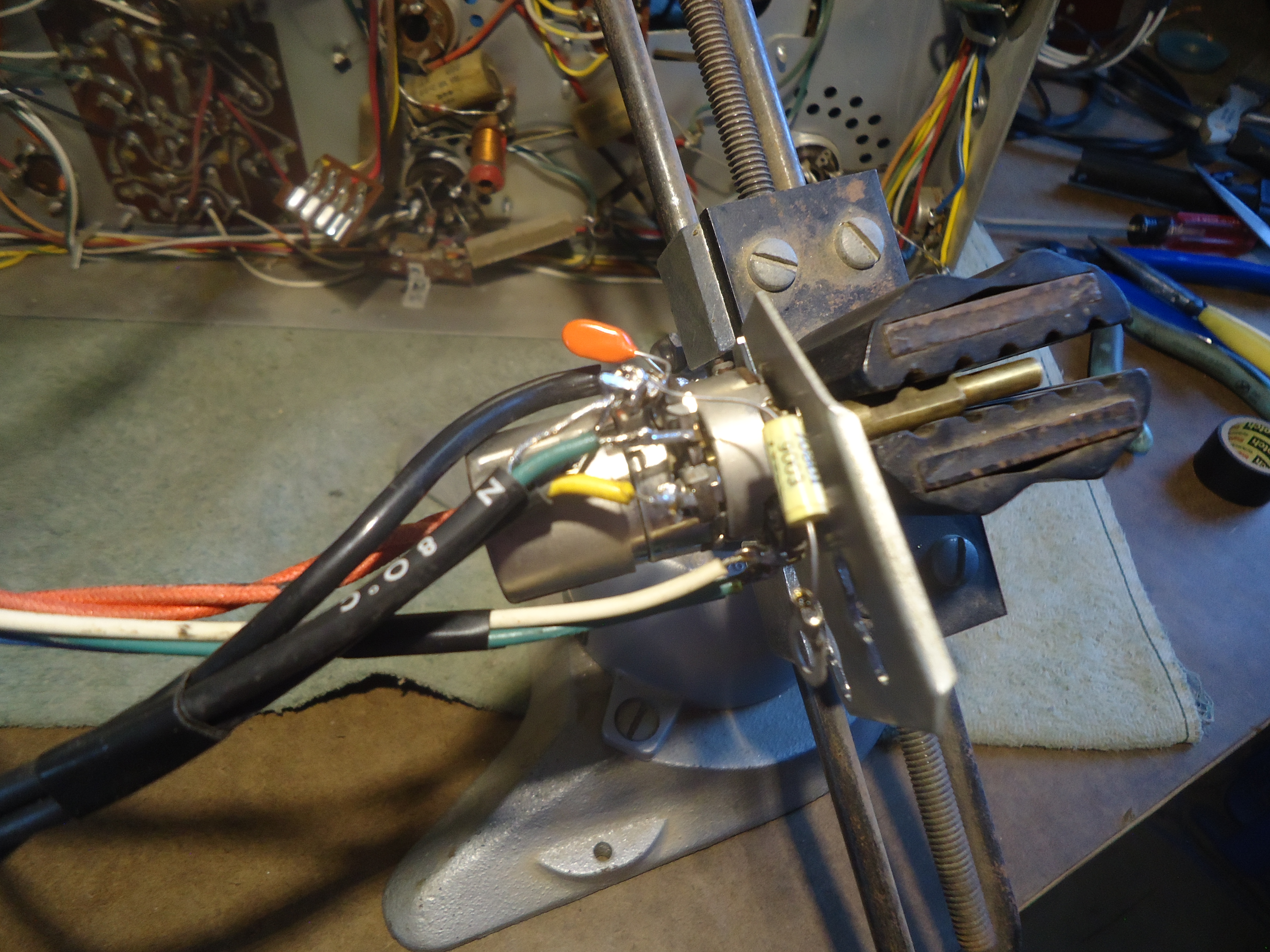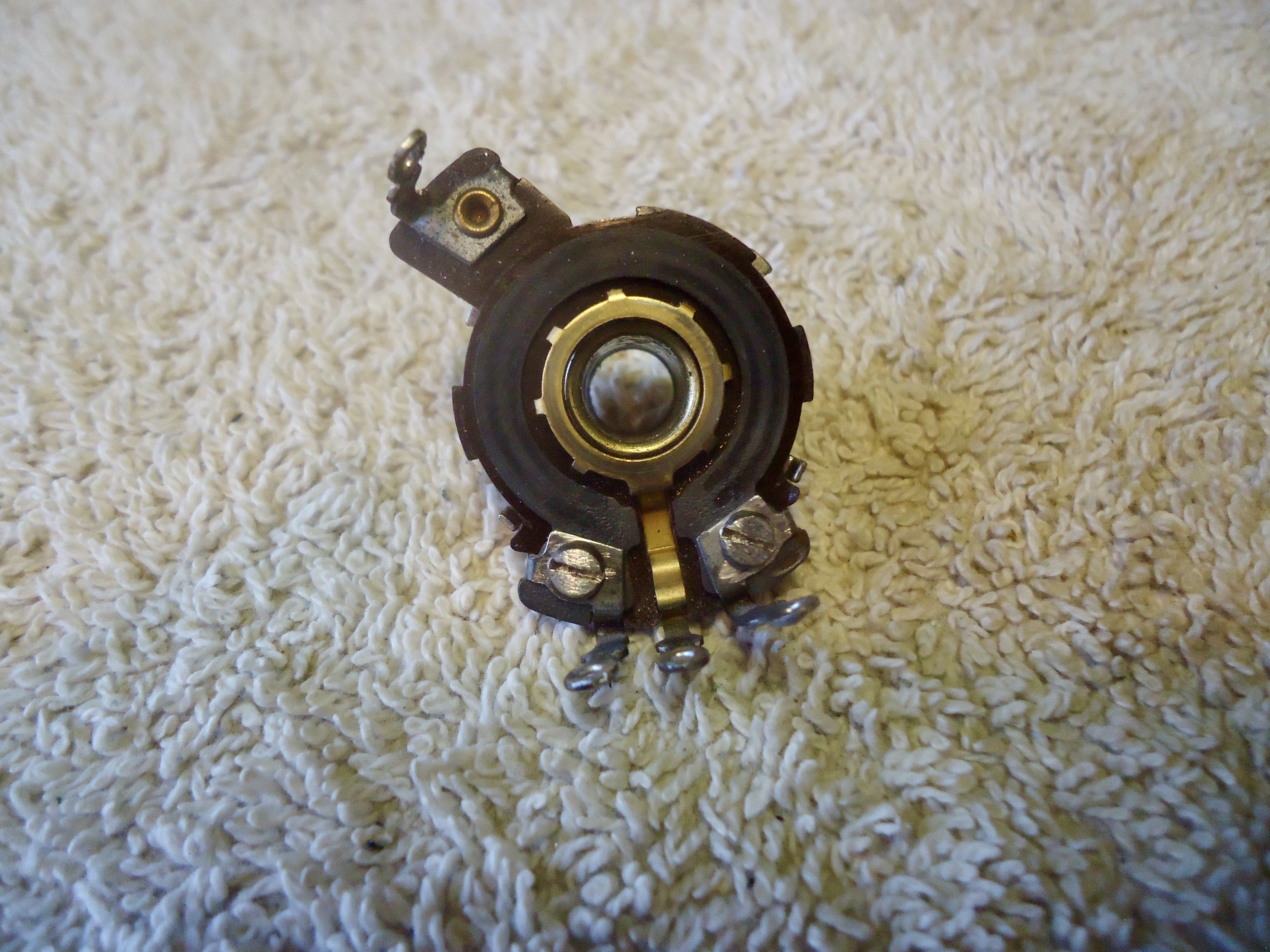 Volume/Brightness control rebuild From Mike, The chassis came to me with no brightness/volume/switch control.# That part was a bunch of broken pieces.# I had a control assembly in my parts pile, but in checking it out, the switch was bad and the 1 megohm volume control pot was "open circuit"# The part number for this piece is RCA 102156 which, as far as I can tell is un-obtainable.# If this chassis is going to work again, the control that I have here would need to be re-built.# A very delicate operation.# The problem was the brass rivets that contact the wire lugs to the carbon path of the pot were loose.# So, I had to try something that I have never tried before, and apparently, it worked. Pix 1# Volume/Brightness/switch loose wires and damaged parts from the original assembly. Pix. 2,3,4 My control with issues like open 1 meg volume control and bad switch. Pix.# 5# Pieces retrieved from broken assembly.# These had some usable parts that I used in the re-build process. Pix. 6 Disassembled for repair. Pix 7. I started by drilling with a pin vise by hand to remove the brass rivets, but the rivet started rotating so I switched the tooling to Dremel tools. This worked well. Pix. 8. The repair is a success showing the 1 Meg reading on the ohm meter. Pix. 9,10.# Details of the #2/56 screws that replaced the rivets that I removed. Pix. 11.# Control re-assembled and ready to install including the new switch unit. Next, is to install this unit and then figure out the connections for the crt wires and get them hooked up.# Then, it is time to fire it up and see what we have got. Cheers,# Mike https://visions4netjournal.com/wp-co...SC03102-1.jpeg https://visions4netjournal.com/wp-co.../DSC03103.jpeg https://visions4netjournal.com/wp-co.../DSC03104.jpeg https://visions4netjournal.com/wp-co.../DSC03105.jpeg https://visions4netjournal.com/wp-co.../DSC03106.jpeg https://visions4netjournal.com/wp-co.../DSC03107.jpeg https://visions4netjournal.com/wp-co.../DSC03108.jpeg https://visions4netjournal.com/wp-co.../DSC03113.jpeg https://visions4netjournal.com/wp-co.../DSC03115.jpeg https://visions4netjournal.com/wp-co.../DSC03116.jpeg https://visions4netjournal.com/wp-co.../DSC03117.jpeg Stay Tuned.