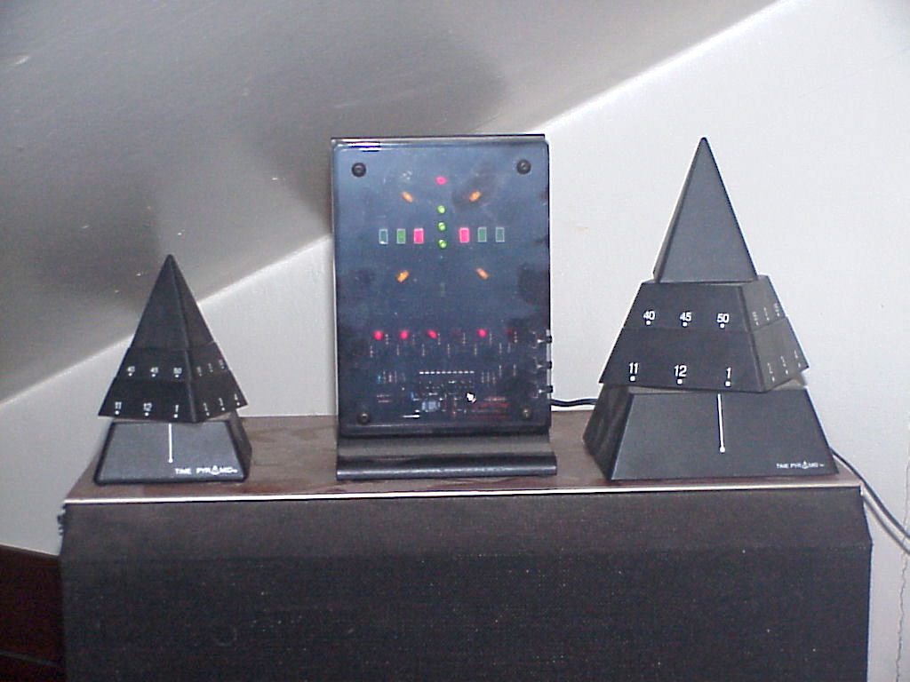 As for the 'pyramid' photo, those are two Time Pyramids flanking an Alien Clock. One of the Time Pyramids doesn't keep good time, but the array sure looks neat, I think. Just a few of the many clocks in my collection.....