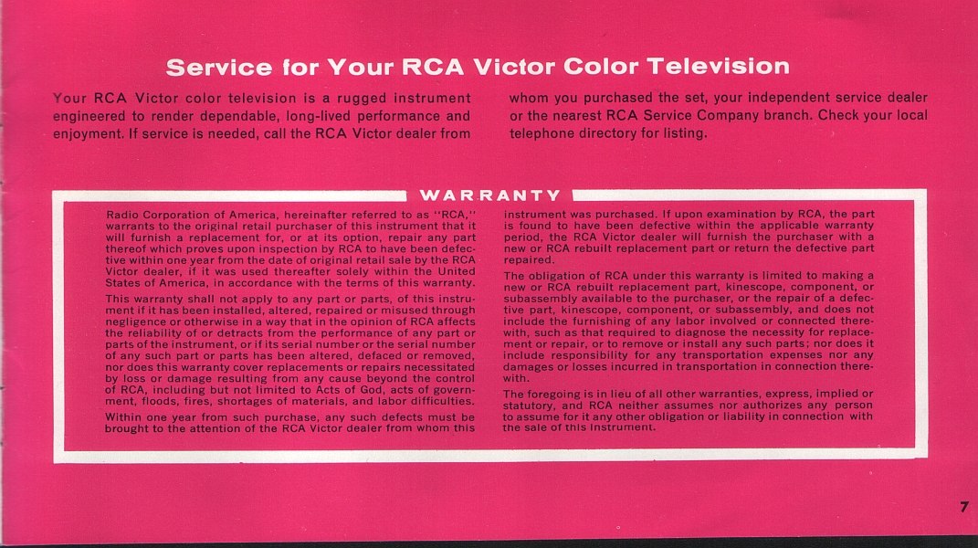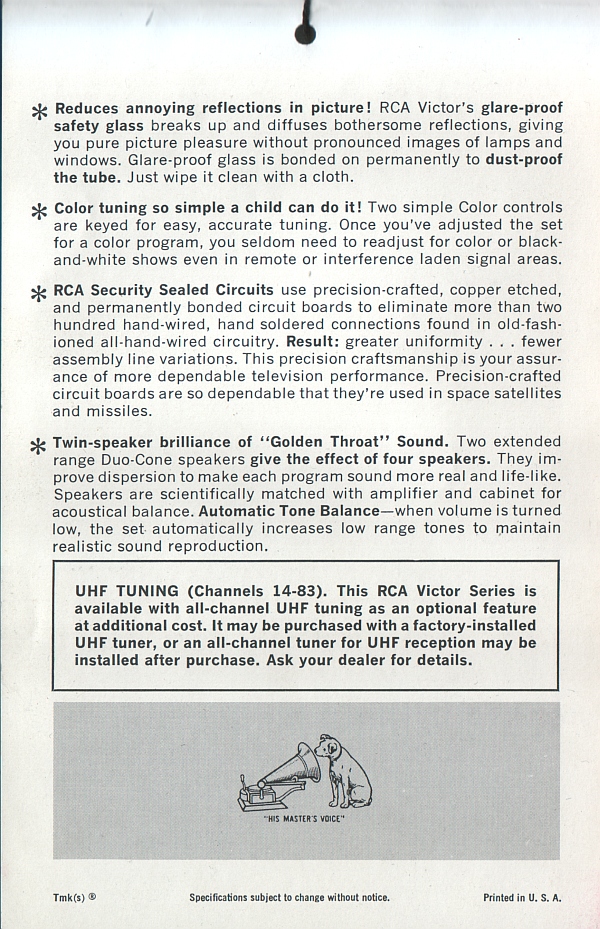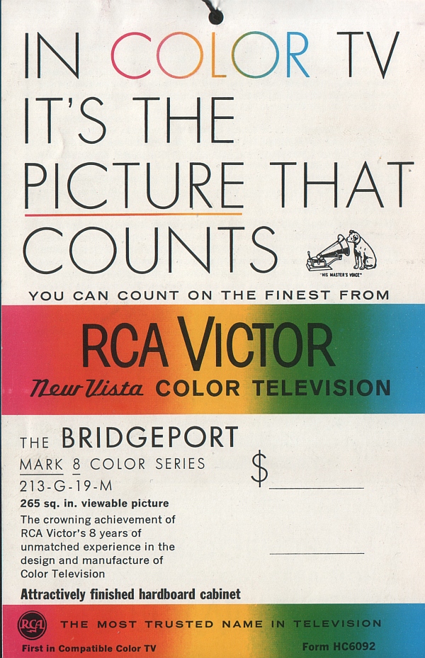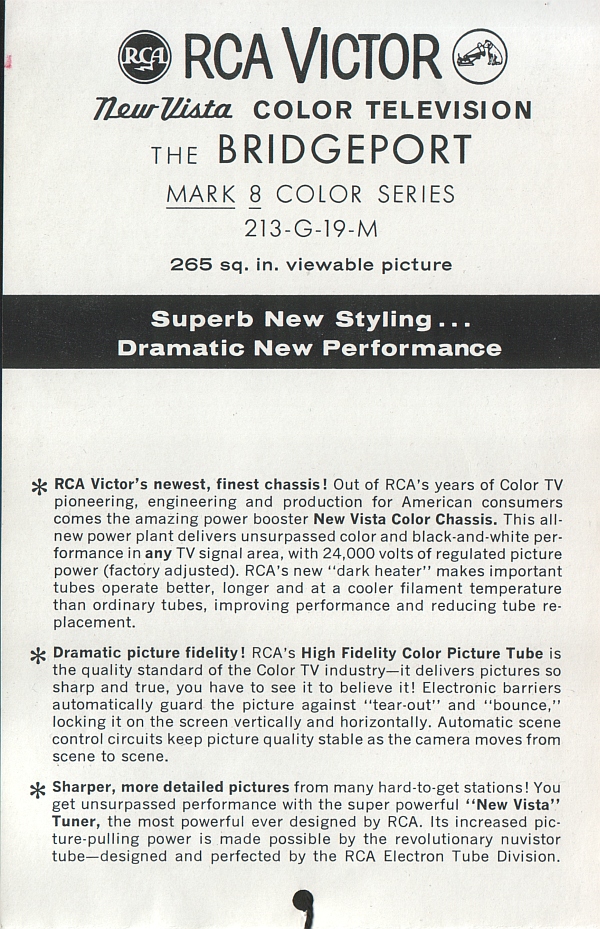 Once we bought a corner cabinet at an estate sale and it came with this RCA lit in a drawer. It looks like someone saved it from when they bought a new TV set in '62 or so. What's also interesting is that there was also a solid state TV brochure from '72 in there. I'll scan and post that next. For now, here's the stuff I found for the RCA 213-G-19-M "Bridgeport" from the Mark 8 (CTC-12) series: Hang tag rca1 rca2 rca3 rca4 Manual rca5 rca6 rca7 rca9 rca10 rca11 rca12 Schematic Enjoy! |