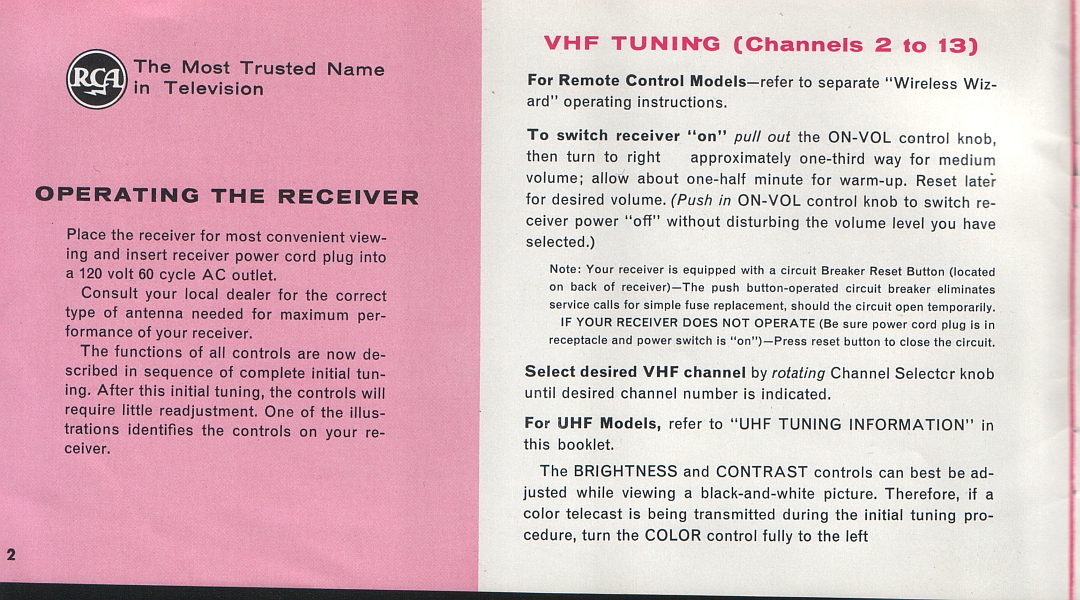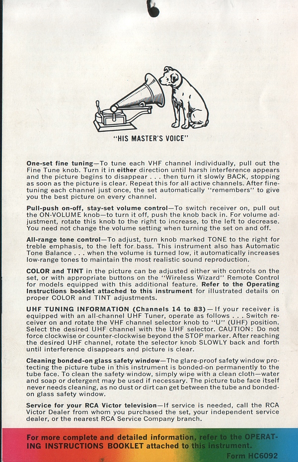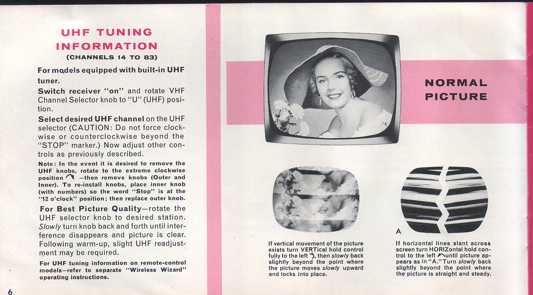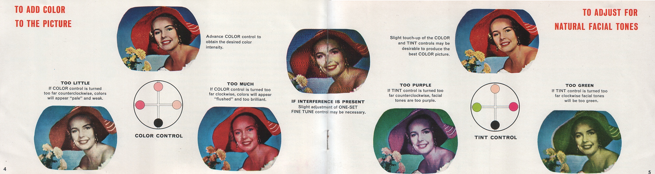 Thanks for including the great graphics. I wonder how long RCA Victor used that picture of the woman in the big red hat on their color tuning page of the manual. She's in my CTC-5 manual and I still see her in some early 80's RCA owner's manuals. -Steve D.