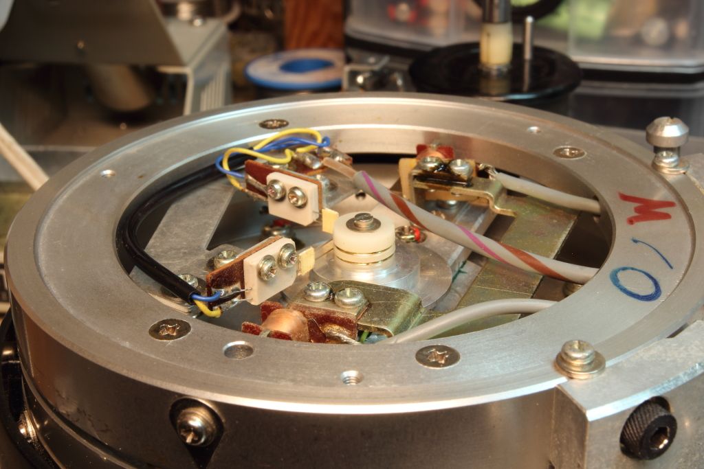 Going back to our more priority issue, we still do not have drum rotation. That I can tell from the documentation it should spin up the moment you put the VTR in standby with an intermediate circuit to handle the initial starting load. Instead it just sits there. ![]() The diagrams say that the motor connects at points 1 and 4 on the DB board. Those two points when in standby read 11.5v so a voltage is present but weather or not it's what we're looking for might not be the bigger problem. Reading for a resistance across the leads from the motor and presumably its winding are infinite. ![]() Either the lead to the motor has gone bad, the motor doesn't have a type of winding I'm expecting....or the winding has opened. Unless my observations are wrong that's the end of the line. Getting at the motor isn't at all easy and requires removal of the precisely aligned video head and surrounding mechanism which I do not have the tools to confidently realign. Edited: The exploded view of the drum shows that there's an intermediate contact I forgot about. There's brushes or something similar inside. That's another potential fault point but again, it's located underneath the video head and cannot be removed form the underside. Edited: THREE BEERS LATER: ![]() ![]() Well there's the problem. The motor brushes are pressed against the commutator with a thin metal bracket and foam. No surprise but after 50 years said foam has lost its ability to spring back, resulting in pretty much no contact. I'm not entirely sure how to proceed from here. Any ideas? Last edited by MIPS; 12-11-2015 at 01:23 PM. |