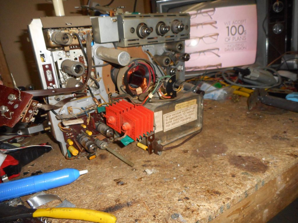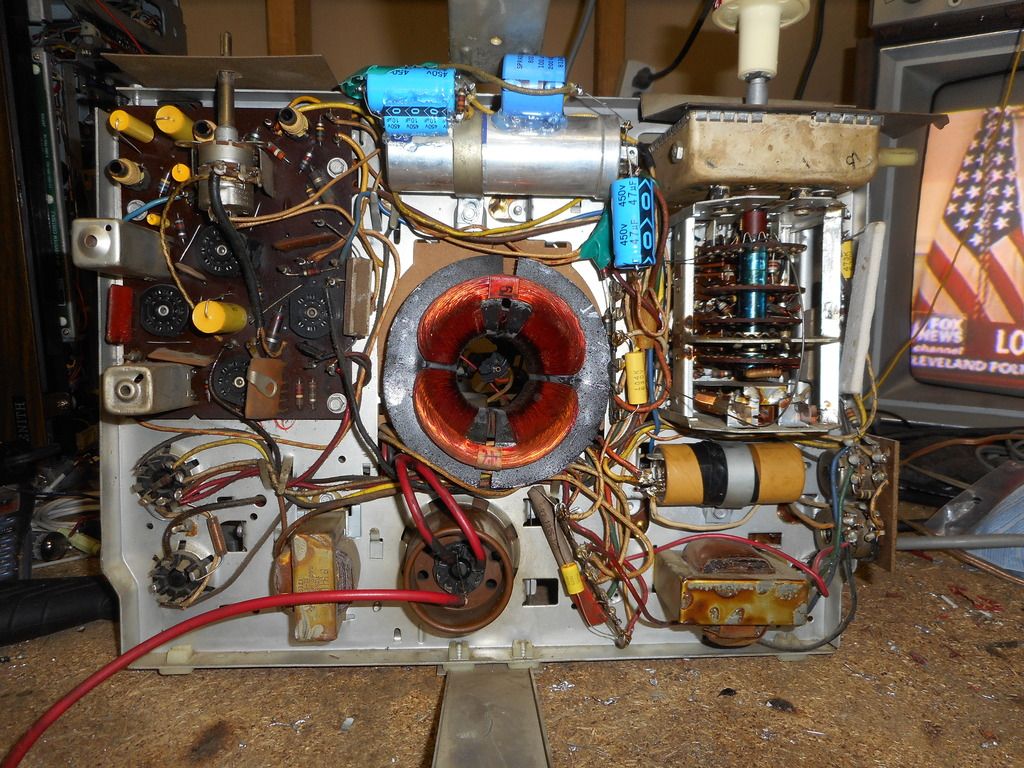 I finished the recap, and selenium replacement...Save for the 100uF 450V section of the top can...Which tested good, and I don't have a replacement for. It works well, but I can tell from how much sharper, brighter, and more contrasty my 8" test CRT is that the original 17" jug in it is far from great....I may eventually add a brightener if I put this in regular service. ![]() ![]() ![]() ![]() One odd thing is that the Horiz AFC diodes are mounted on their own terminal strip despite having a perfectly good place to attach to the board....It's like a previous run had a bad batch of diodes and they expected these to fail too. ![]() To give an idea of the compactness here is a shot of it on a 17" RCA....The only thing I have with the same CRT that might be more compact is a Setchell Carlson portable.
