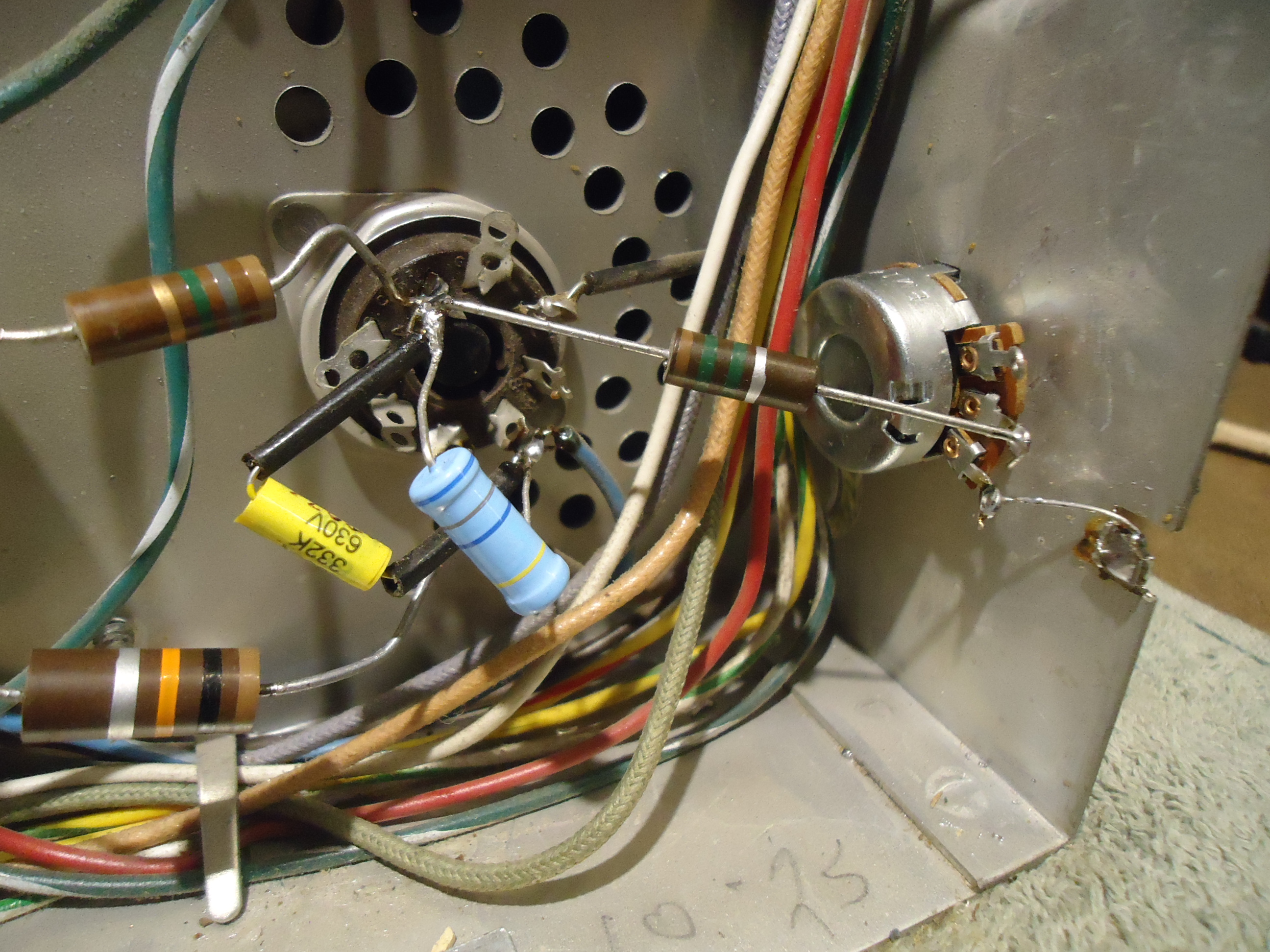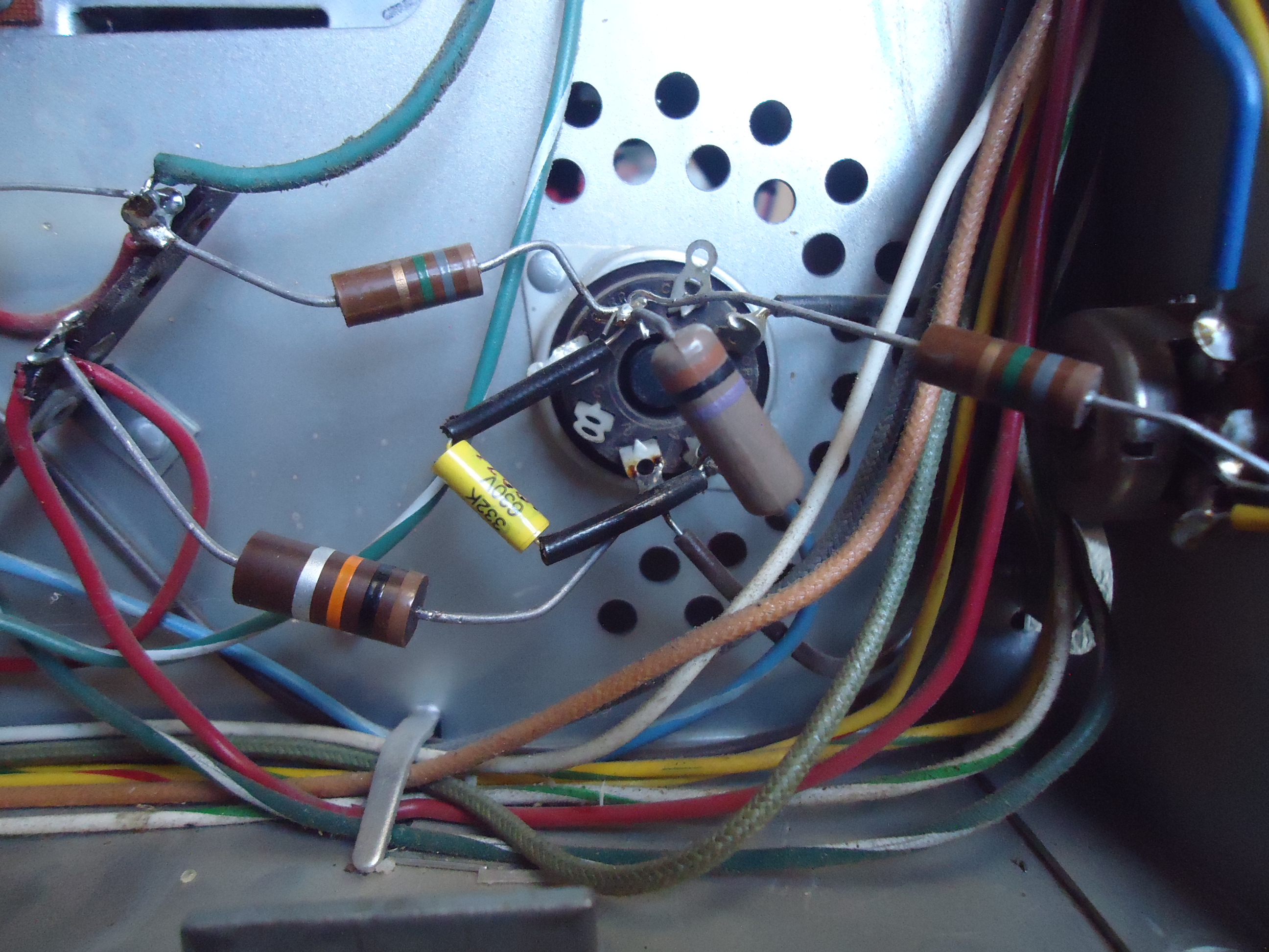 Greetings Marshall. I started looking at the CTC5 again this evening and I will be attacking the H.V. regulation modifications next. The plan is to install a H.V. adjustment control in place of the Matrix Balance control which is located right next to the 6BK4 regulator tube socket. The Matrix Balance control never worked on any CTC5 that I have ever worked on. Every chassis that followed the CTC5 did away with it and replaced it with 470 ohm resistors at the cathodes of the demodulator tubes, and that is what I will do here. The pictures attached are as follows. Pix 1 The parts that came out of the AGC, SYNC, Audio I.F. board from the last update. I missed sending it at that time. Pix 2 is the 6BK4 Shunt Regulator socket. Notice the control on the right side with a yellow and blue wire. That is the Matrix Balance control that I will remove. In place of it will go a 10 megohm pot that will allow control of the H.V. regulator. I have already disconnected those wires on the other end where they connected to the demod tubes. Since this modification causes changes in the Chroma circuits, I will be doing the component replacements in that section next instead of moving to the Vertical sweep section. I did a random "in circuit" check of resistors in the Chroma section and there are a number of resistors that are out of tolerance by over 20%. So, that will be a slow task since it is all hand wired. One more note. The H.V. as measured at this point in time before mods is 17 KV. I hope to be able to adjust between 19KV and 22KV if all goes well. More to come, Stay tuned! https://visions4netjournal.com/wp-co...SC03198-1.jpeg https://visions4netjournal.com/wp-co...SC03197-1.jpeg Good evening. I have made some progress over the past few days. The H.V. Regulator circuit has been modified. A H.V. control now exists and the H.V. can be varied from 16 K.V. to 23 K.V. I have also decided to eliminate the 5U4 Rectifier tubes in the power supply and replace them with a plug in solid state replacement of silicon rectifiers that are rated at 1000 PRV at 2.5 amps. These plug in replacements can be purchased, but I make my own from old dead 5U4 tubes. I break away the glass and save the sockets and install the 1N2007 rectifiers into the socket which makes it plug in directly to the where the tubes were. These rectifiers take the place of both 5U4 tubes for power handling capabilities. The improvement is power B+ stability throughout the chassis and it saves 6 amps of current not being handled by the power transformer to power the filaments of the 5U4s. Since the solid state rectifiers are more efficient, the B+ increases by around 30 volts so I installed a 70 ohm 50 watt resistor (chassis mount type for heat control), to the top of the chassis where the 5U4's were. Now, on to the Chroma circuits. First thing I noticed is a very badly charred terminal strip where a 10 watt resistor mounts. I remembered this from my own set and it is weak spot that needs to be addressed. The charred terminal strip eventually turns in to conductive carbon and if it doesn't disintegrate first, it can actually cause a small fire. This is a very delicate piece of surgery and the 10 watt resistor that caused this damage will be re-mounted to the top of the chassis where it can dissipate its heat away from the chroma circuits. Very bad design on the part of RCA in my opinion. Basically it is a 10 watt resistor in a 15 watt circuit. I have also installed a 5 amp pigtail fuse in line with the power transformer primary. That should have been done by RCA in the beginning. Pix. 1 H.V. reg 6BK4 socket before mod. Pix. 2 H.V. reg 6BK4 socket after mod with H.V. adjustment added Pix. 3 H.V. adjustment set for 16KV Pix. 4 H.V. adjustment set for 23KV Pix 5 5U4 tubes with solid state replacement at the bottom of the pix. Pix. 6 Chroma circuit with charred terminal strip. Hard to see from the pix. I will send pixs in 3 separate emails. I hope it goes well. cheers, Mike https://visions4netjournal.com/wp-co...SC03197-2.jpeg https://visions4netjournal.com/wp-co....-control.jpeg https://visions4netjournal.com/wp-co...H.V.-16KV.jpeg https://visions4netjournal.com/wp-co...H.V.-23KV.jpeg https://visions4netjournal.com/wp-co...h-SS-rect.jpeg https://visions4netjournal.com/wp-co...charred-2.jpeg The chroma terminal strip will be a very slow and delicate piece of surgery. Lots of wire and re-locating of parts to get the heat away from the chroma circuits. Cheers, Mike