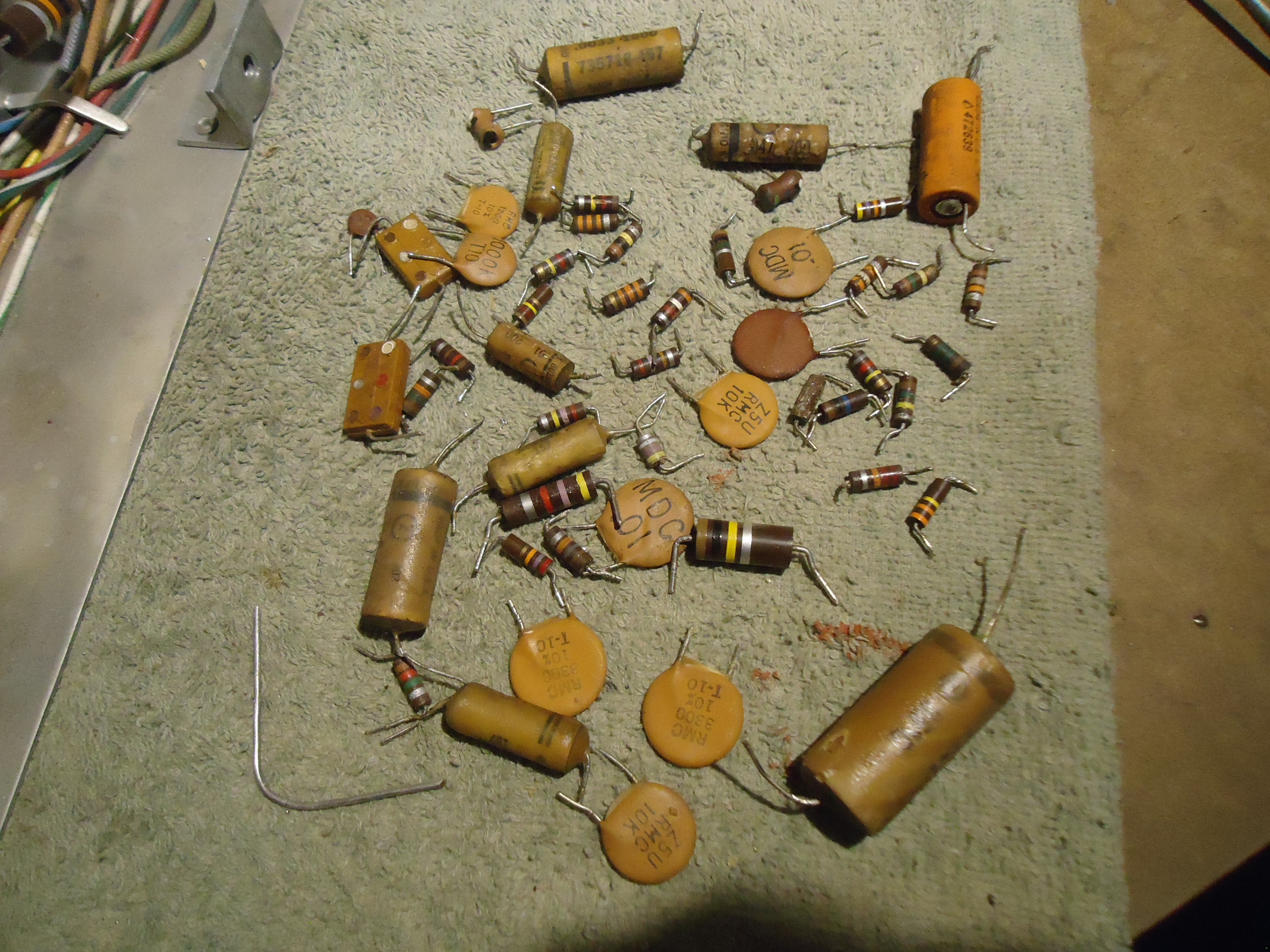 Update. Greetings. I have done many things on the restoration since my last report. A lot of time has been spent on the restoration of the Chroma Circuits. What a mess. But first, let me recap on the last report with details. The first picture will be of the mods in the power supply. Top of chassis showing the two 5U4’s removed and replaced with 1 “plug in” using solid state 1n4007 rectifiers. Also, along side is the 70 ohm 50 watt chassis mount resistor to take care of the increased voltage that resulted in the mod. I also replaced a dual potentiometer for the red/green dynamic convergence. No picture for that. The green section was beyond cleaning. I had a good spare unit in my CTC5 Junk. OK, now to the Chroma Circuits. There have been a number of things to address. One, problem was that the gray scale changed every time I fired up the chassis. Then it would slowly change from red, to green, to blue slowly, then any color and back again. This usually resembles a failing CRT, which is not the case here. I traced this problem to the tube sockets of the R-Y, G-Y, and B-Y / Blanker tubes. (12BH7’s). The filaments were changing in brightness. It was necessary to replace both of those tube sockets. The gray scale is now stable. Another issue with the Chroma rebuilding was a failing terminal strip. In the picture, this can be seen above center in the full view photo. Also shown close up in another photo. The terminal strip overheats due to a big 10 Kohm 10 watt resistor that never should have been installed there. I have moved it to just above the chroma circuits, and away from the sensitive tuned coils. It can be seen in the full view photo just left of center. It looks like a cement rectangle. In the later photo, it is missing because I moved it out and away from the Chroma Circuits. and you can see where I replaced a burned wire with a new white wire. I replaced a lot of resistors that were way out of tolerance, and of course all wax type capacitors. Photo 1 5U4 tubes removed and solid state rects installed. Also, 70 ohm 50 watt resistor chassis mounted for heat dissipation. Photo 2 Chroma strip charred Photo 3 Chroma Circuits b4 component upgrades. Photo 4 Chroma strip replaced Photo 5 Relocation of the 10 K ohm 10 watt resistor Photo 6 Replacement of the 2 tube sockets bottom view Photo 7 Replacement of the 2 tube sockets top view Photo 8 The Chroma Circuits finished with rebuild Photo 9 All the components that I replaced in the Chroma Circuits. Photo 10 CTC5 Color pattern when finished with Chroma Circuits. Next is the Vertical sweep board. https://visions4netjournal.com/wp-co...h-SS-rect.jpeg https://visions4netjournal.com/wp-co.../DSC03220.jpeg https://visions4netjournal.com/wp-co...p-charred.jpeg https://visions4netjournal.com/wp-co...-B4-recap.jpeg https://visions4netjournal.com/wp-co.../DSC03218.jpeg https://visions4netjournal.com/wp-co.../DSC03219.jpeg https://visions4netjournal.com/wp-co.../DSC03215.jpeg https://visions4netjournal.com/wp-co.../DSC03216.jpeg https://visions4netjournal.com/wp-co.../DSC03214.jpeg https://visions4netjournal.com/wp-co.../DSC03213.jpeg https://visions4netjournal.com/wp-co...n-rotated.jpeg
