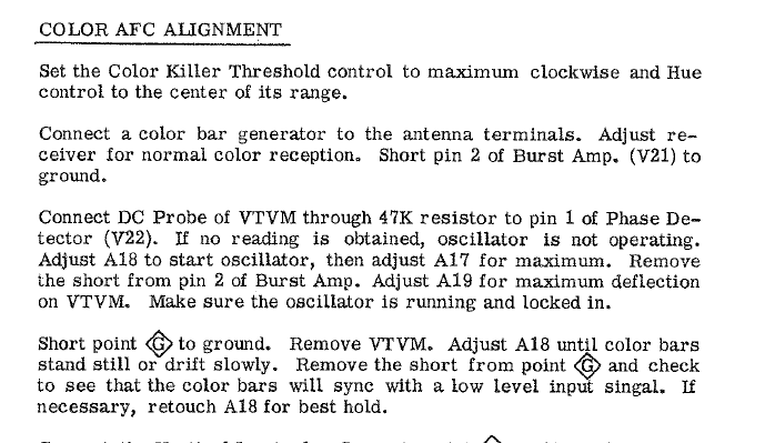 Measurement taken with color killer full CW ( not sure about that ) and tint in center, with clolor bar generator input on tuner. TV set for normal color operation, it says “short pin 2 of burst amp V21 to ground. Then to look at the voltage of the phase det pin 1 with a volt meter through a 47k resistor, this is as to not load it down, if no reading, oscillator is not running, adjust A18 to start, then adjust A17 for max reading. Do NOT skip that step. If you see a reading at pin 1 V22 through a 47k with pin 2 of burst amp V21 shorted to ground as the procedure says to do, move on to adjust A17 for max reading. Then go to next step.