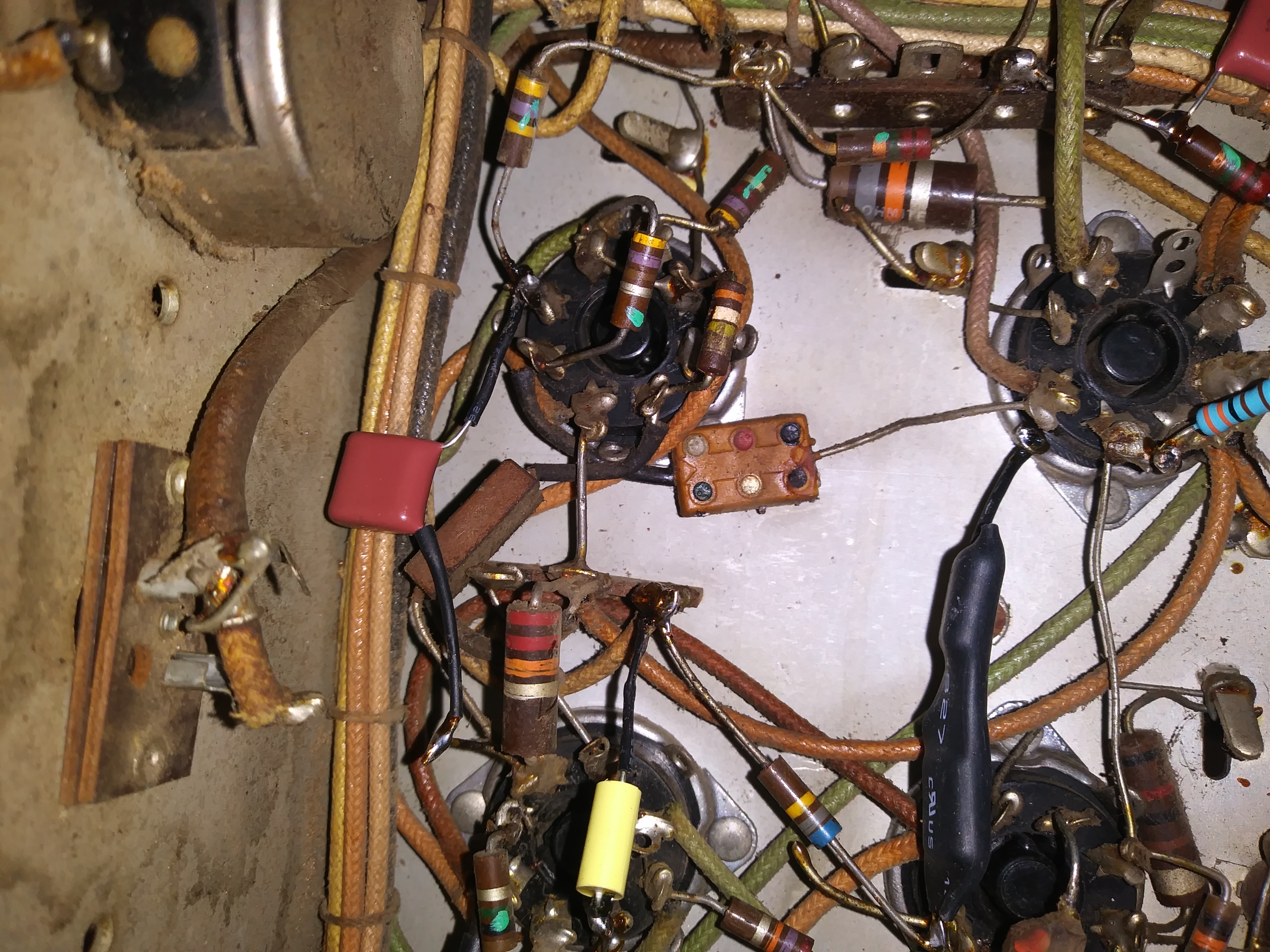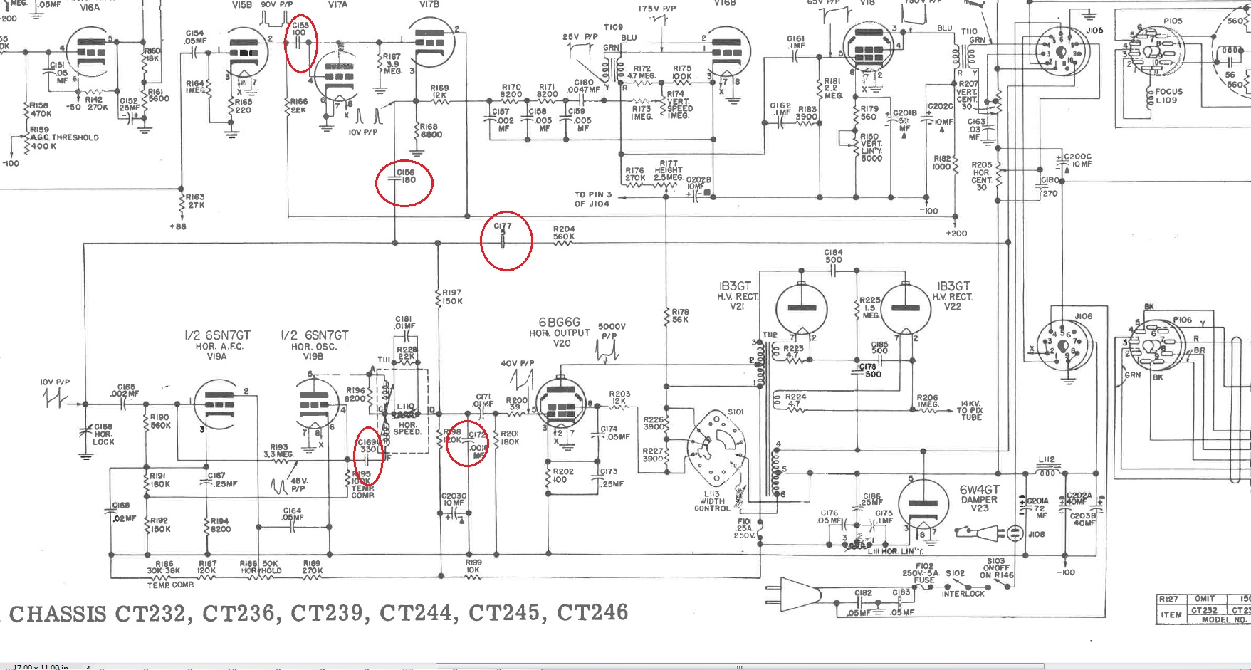 The only difference I see from this set and early RCAs is that RCA had the focus circuit in series with the -100v line, and this has it in series with the +250v line, other than that, they seem the same. Since I can't get an original OEM pot, I guess I will have to keep the focus pot isolated from the chassis, and mount is elsewhere, not sure why it burned through the dielectric of the pot again, it's not like it is being hit by huge voltages or something. :/