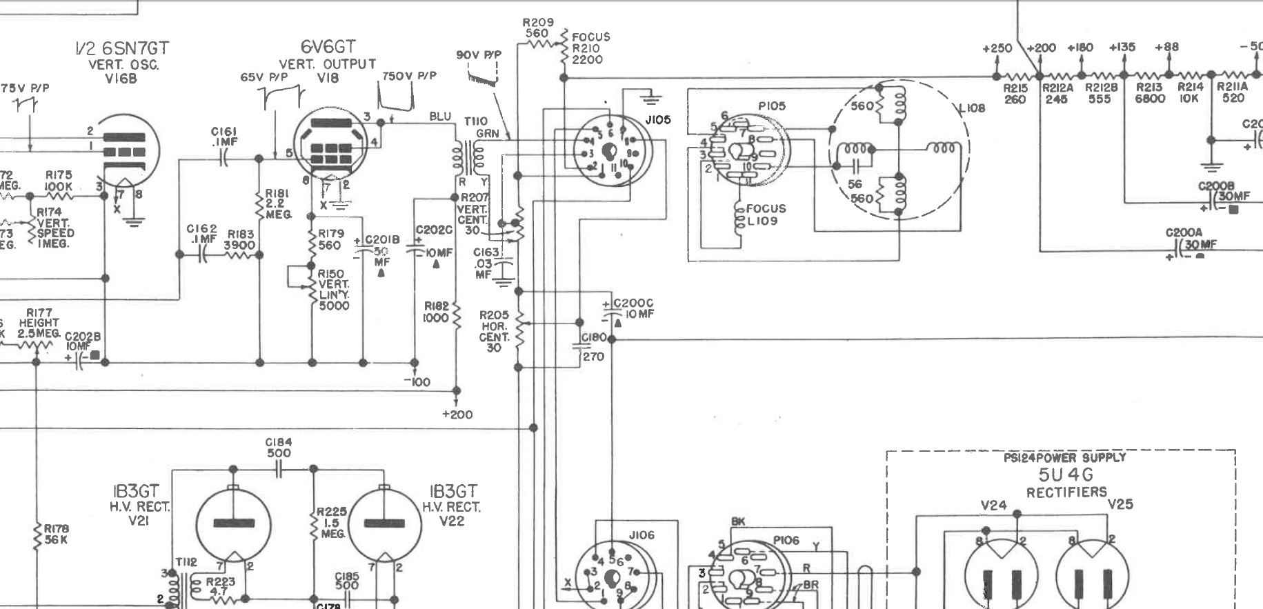 Right side is controlled by the horizontal output tube. The cap in the yoke suppresses ringing. Pretty sure C180 filters noise out of the DC bias horizontal centering control. |