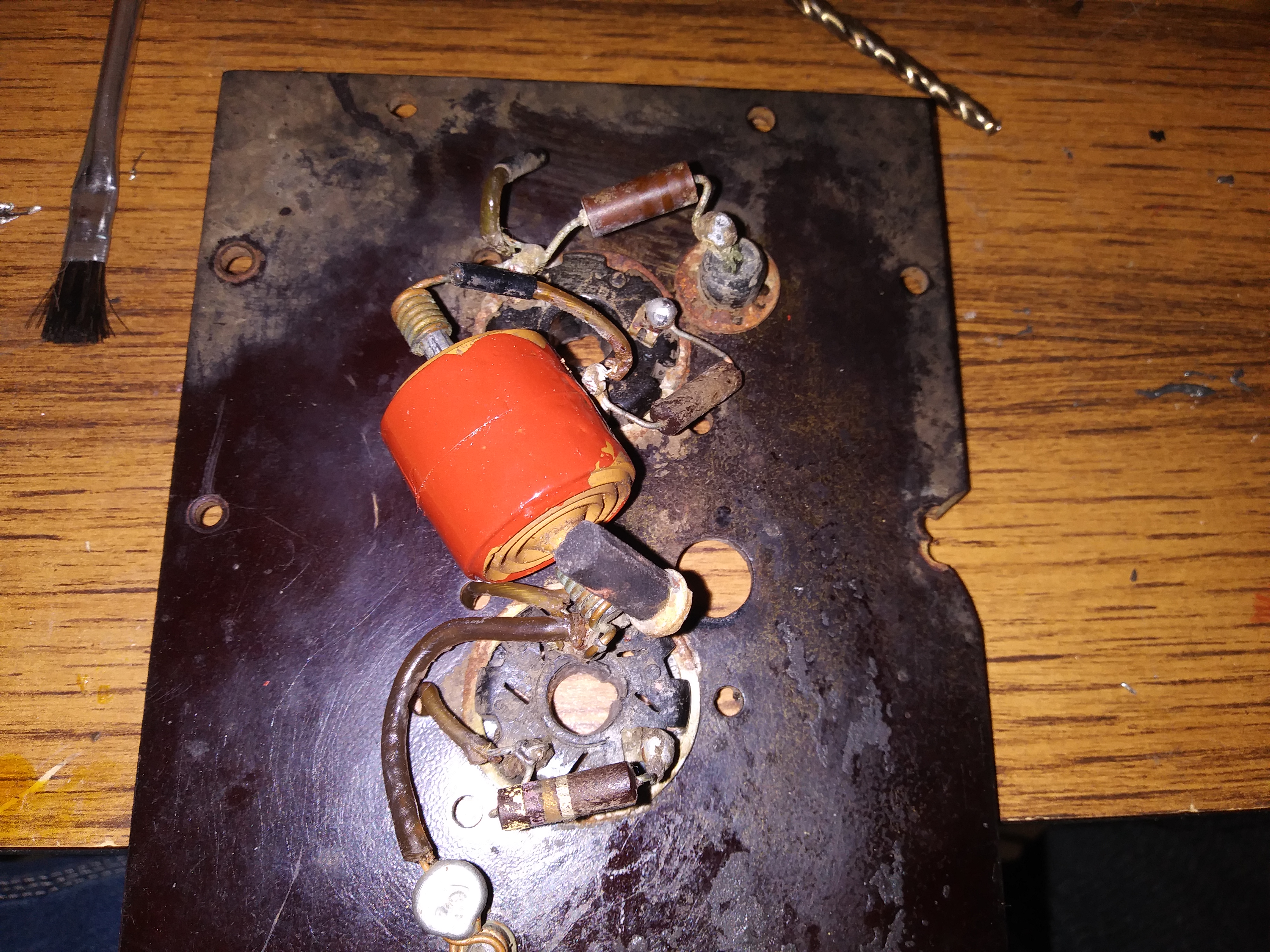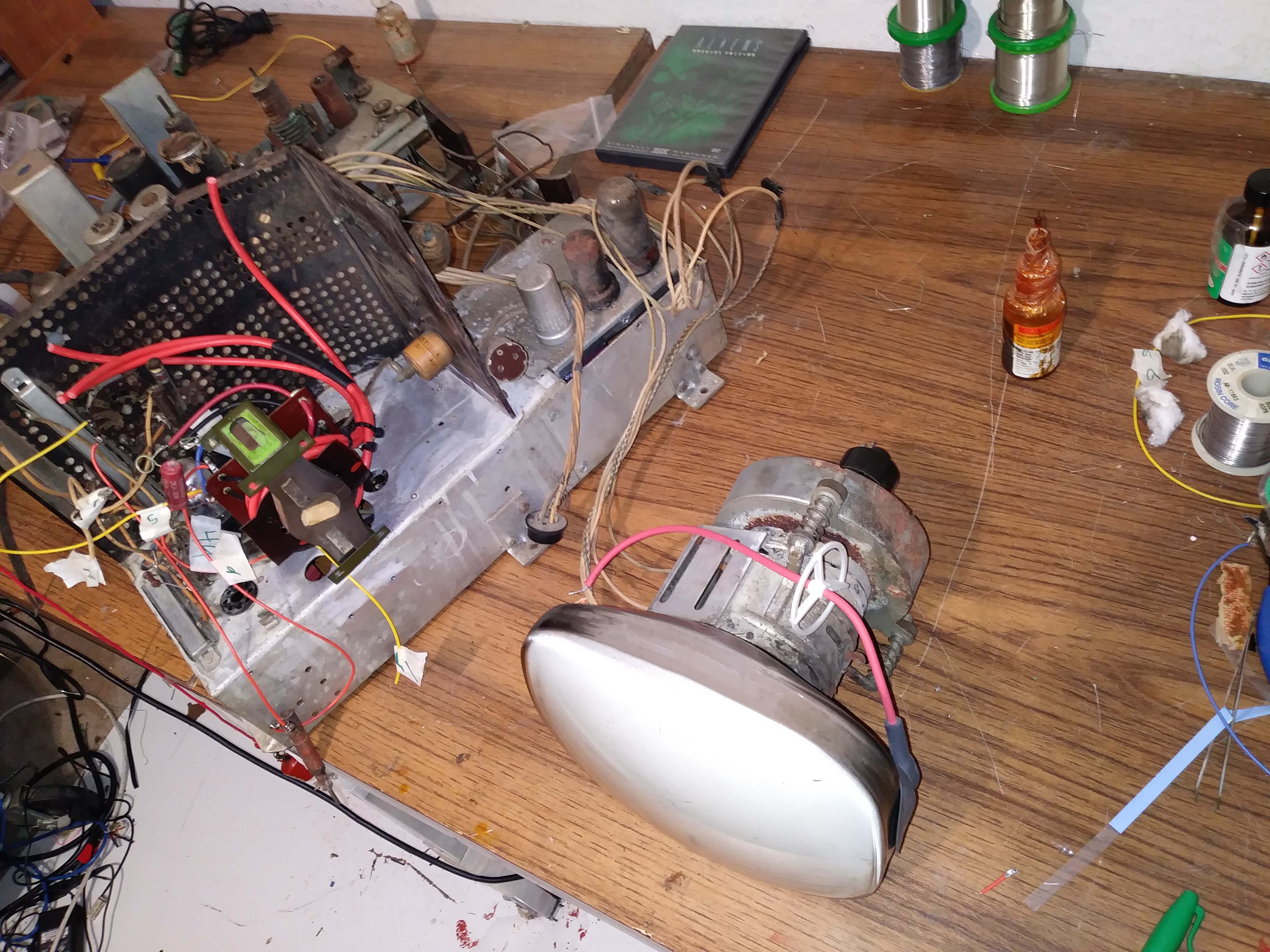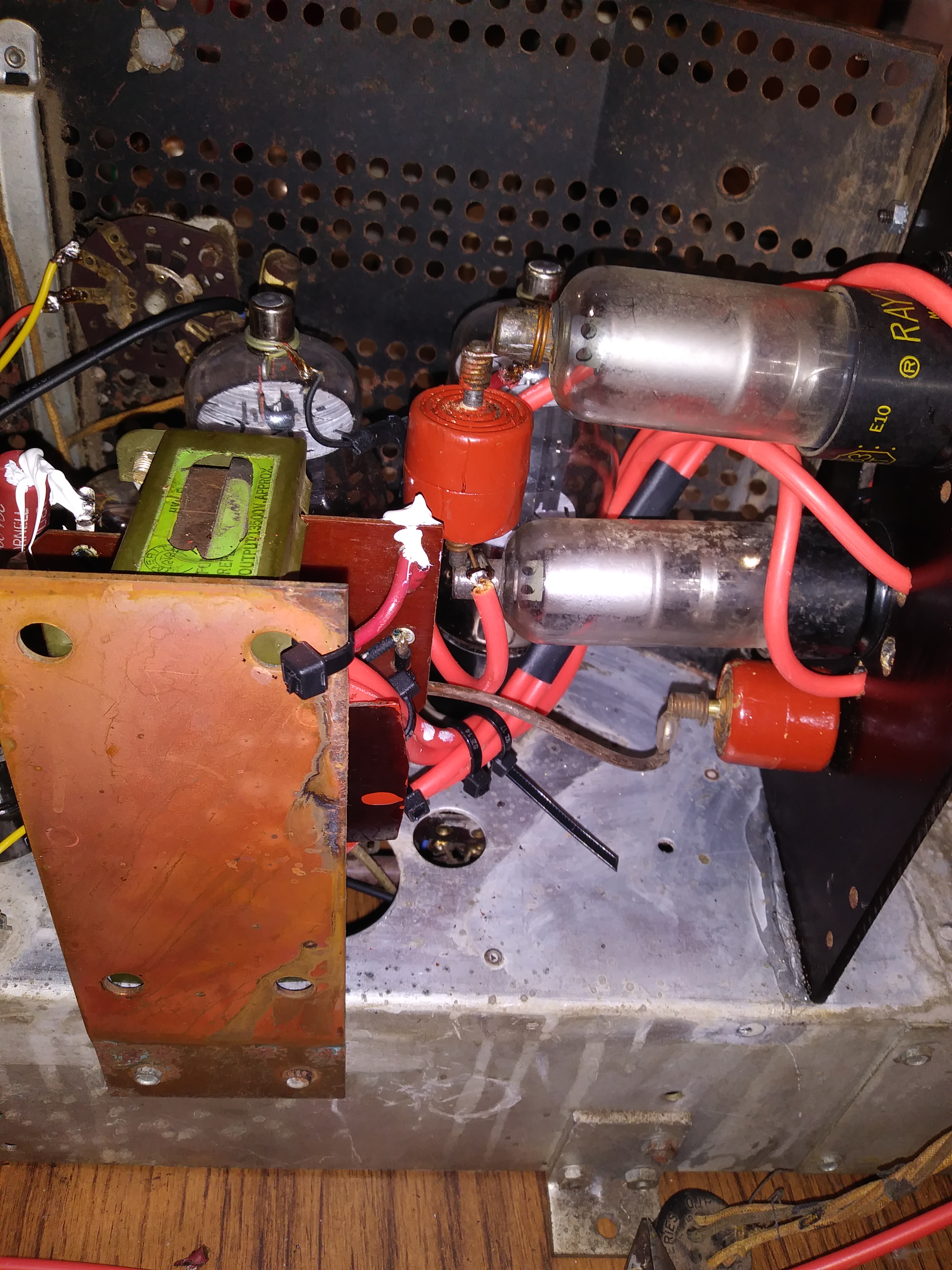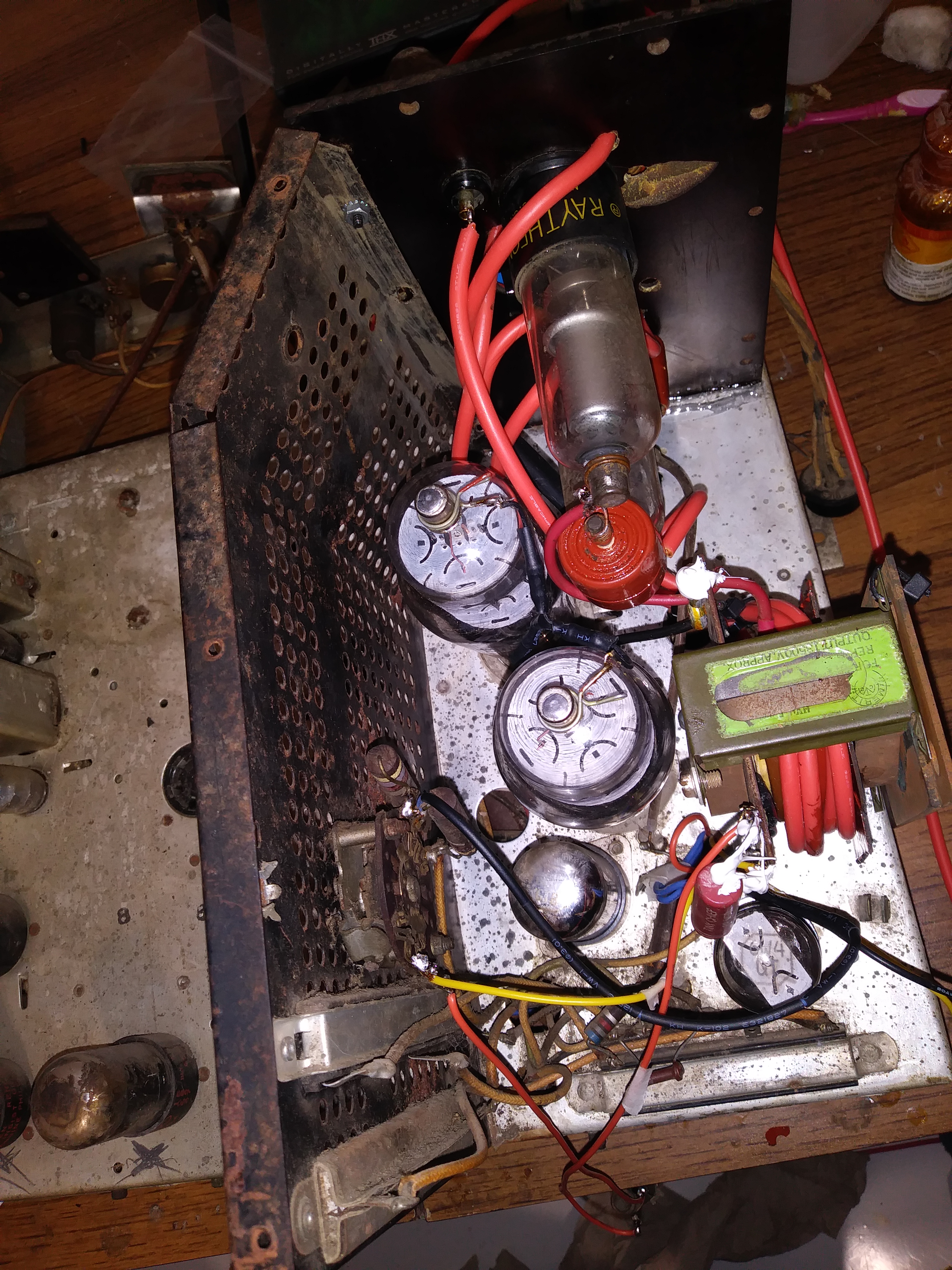 When I first got this set, the cover was off of the HV cage and the 2 HV rectifier tubes were out and set aside, indicating someone was trying to debug a HV problem and gave up and left it to sit for untold years.