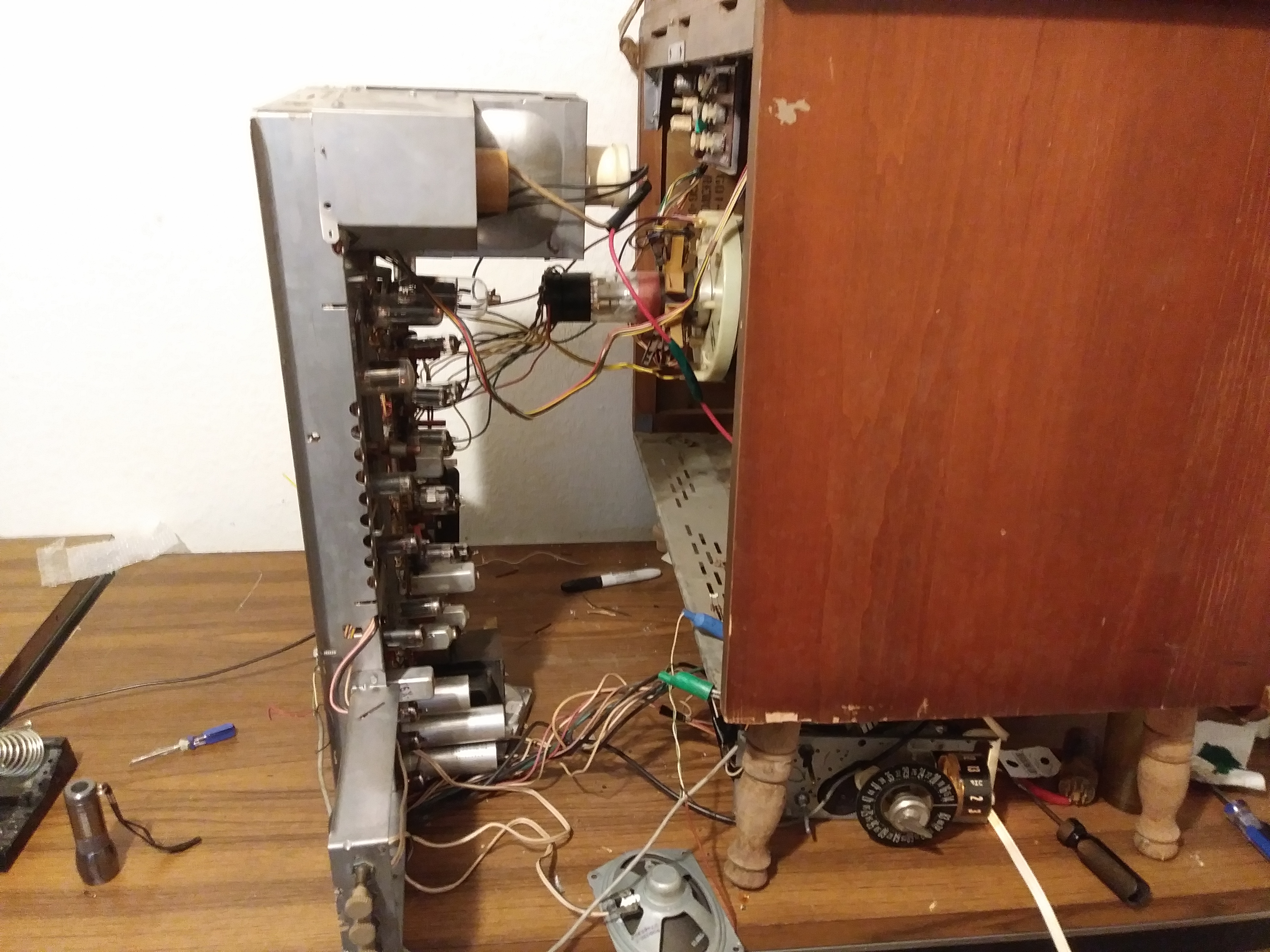 around each tube pin I wanted to measure something on, then plug the tube back in and I had access to whatever I needed on that tube.... But it would be best if you had a nice little bench you could put the chassis on, flipped like that and make all your measurements.... Just build one, it's not like it's going to add significantly to the time it's taking to get this tv working anyway..... And with all you spent on caps, precision resistors, tubes, diodes, & thermisters, flyback transformers, you cudda just took out all that stuff and put a flat screen in it already..... So just build a nice chassis table, put some movable arms on it, mount a few lights, do it up nice! Oh, and don't forget add one or two cupholders..... .