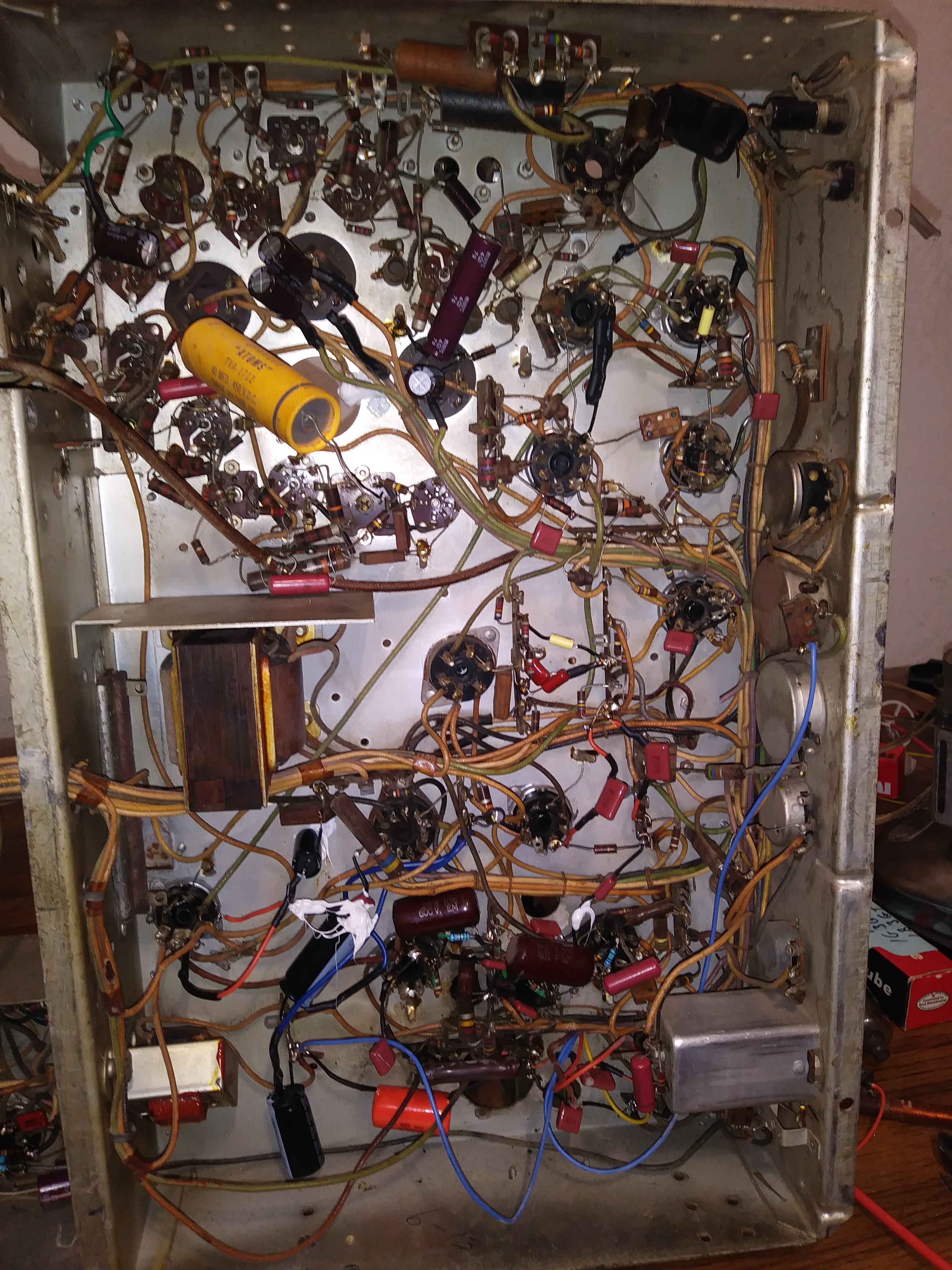 The IF tubes are in an unknown state, no way to test, so got 4 new, (6AGS) and tuner tubes. Did try to clean tuner. Will replace weak resistors as I wait for new tubes. Focus pot decided to arc out on me, dirt in solder lugs, had to scrape it out and coat with dope.