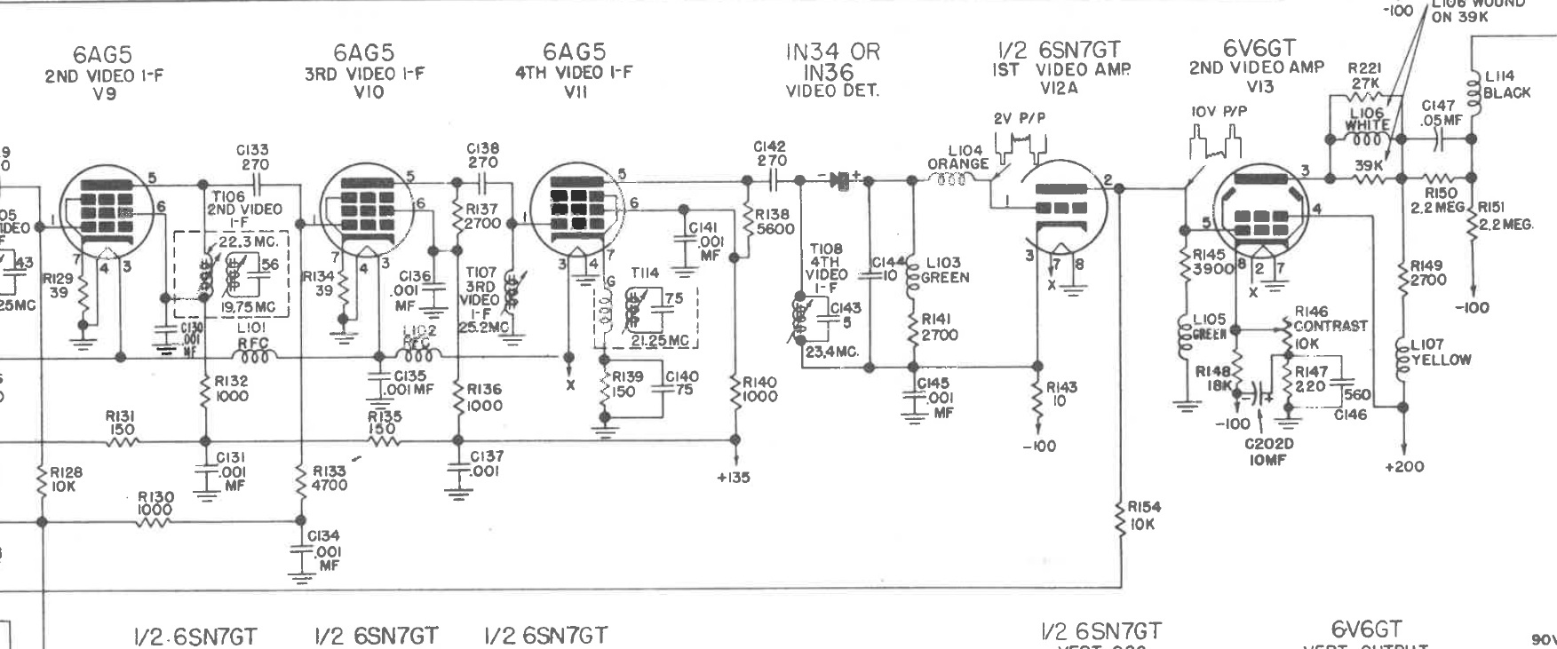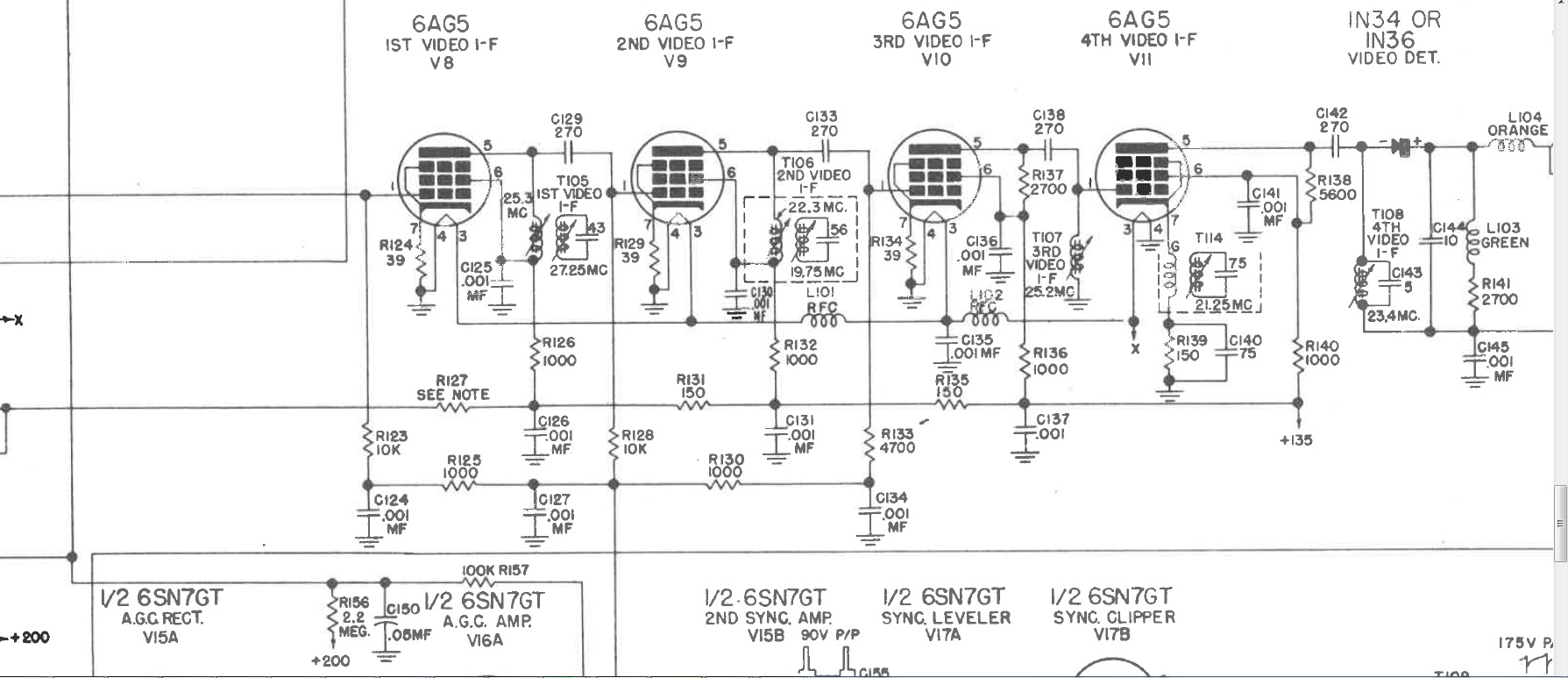 This 1st amp is a bit different from what I have seen before. no direct positive power on the plate, seems to be driven from the -100 on the cathode, through the 10 ohm resistor (13 ohms OK) and up via r145 and L105. both OK. R154 goes to sync. The Det diode is odd looking , Sylvania made 1n36.but has a fiberglass body with metal end caps, looks a lot like selenium rectifiers I have seen before. but a 1n36 can't be selenium... Just have not seen one like it before as a det. not sure if it's good or bad, not sure how to test it. it's acting weird. I do have a 1n60. In the meantime, if i were to feed a 2v wave from a generator to the grid of the 1st amp, if all is working to the screen I should get some kind of pattern on the screen, if I'm correct.